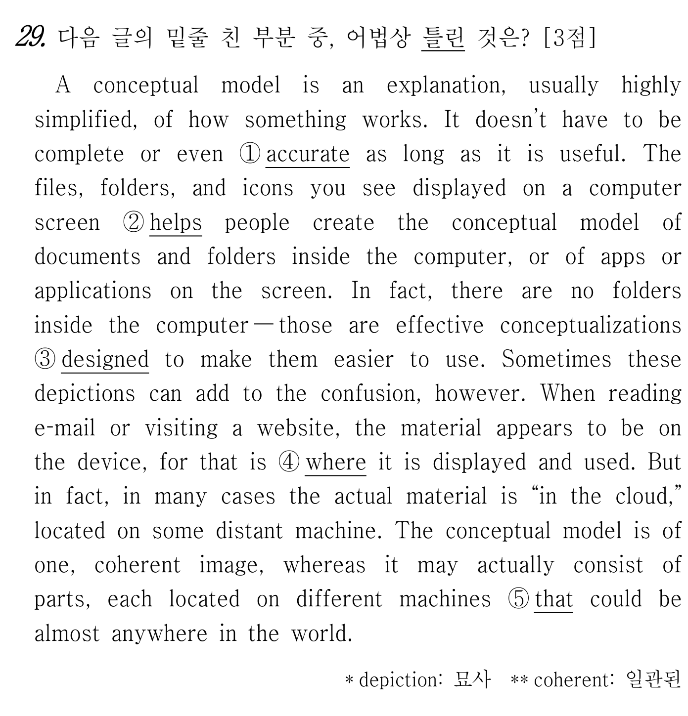 이 문제는 '개념적 모델'이 실제와 다를 수 있다는 점을 지적하는 글이에요. 2번 문항의 경우, 컴퓨터 내부의 폴더가 진짜 물리적인 폴더가 아니라는 점을 강조하는 맥락이죠.