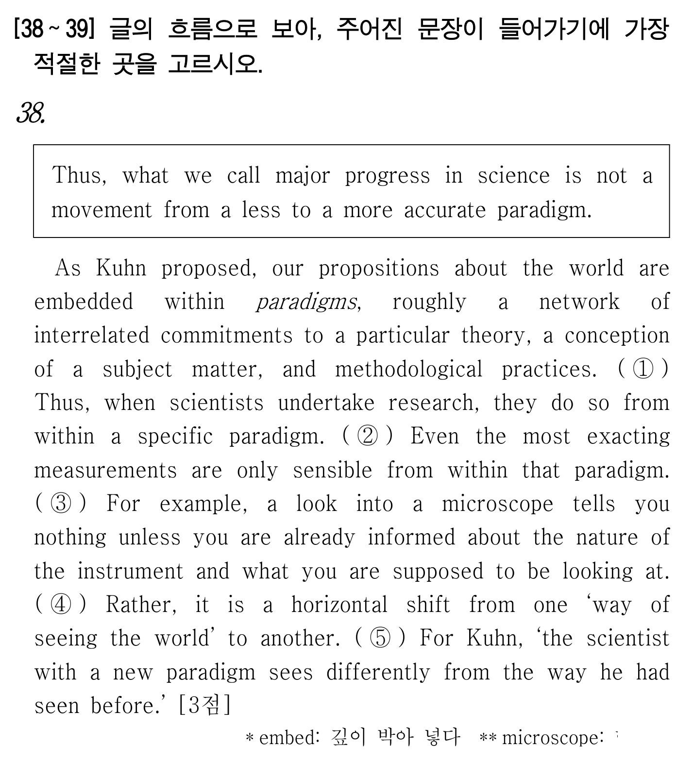 이 문제는 연결어 Thus와 대조 구조(Rather)를 찾는 게 핵심입니다. 4번 문장 앞까지는 '패러다임 내부에서의 연구'에 대해 설명하고 있죠? 그런데 4번 뒤에 나오는 Rather(오히려)는 앞선 생각에 대한 반박이나 수정이 나올 때 씁니다. 즉, '진보가 이동이 아니다'라는 부정의 내용이 나오고 나서야 '오히려 그것은 수평적 이동이다'라는 정답이 올 수 있는 것이죠!