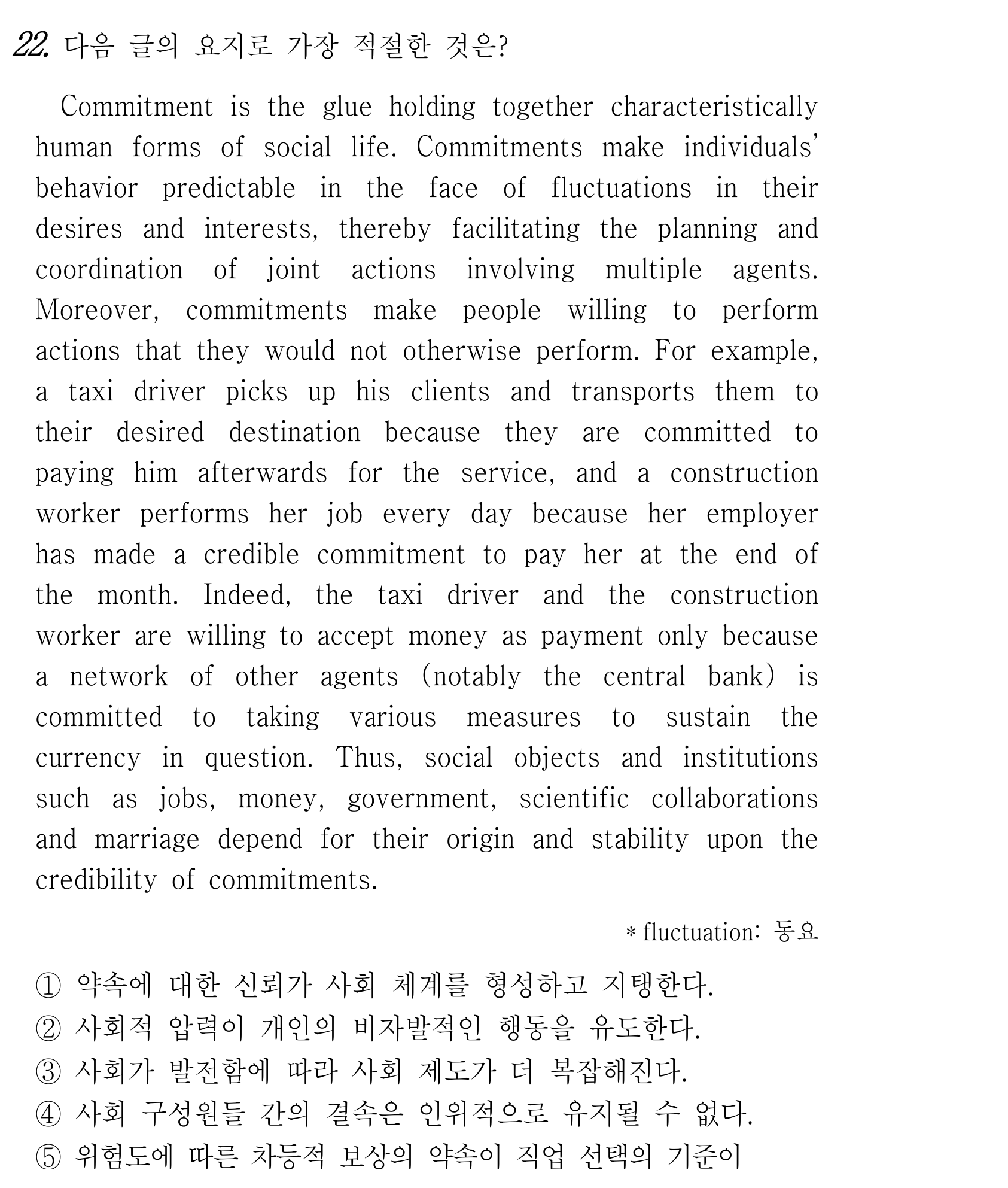 이 문제는 글의 첫 문장과 마지막 문장이 주제를 관통하는 아주 정석적인 구조예요. 첫 문장에서 "약속은 사회생활의 접착제"라고 선언하고, 중간에 택시 기사와 건설 노동자의 예시를 들어 구체화한 뒤, 마지막에 "모든 사회적 제도는 약속의 신뢰성에 의존한다"고 결론짓고 있지요.
