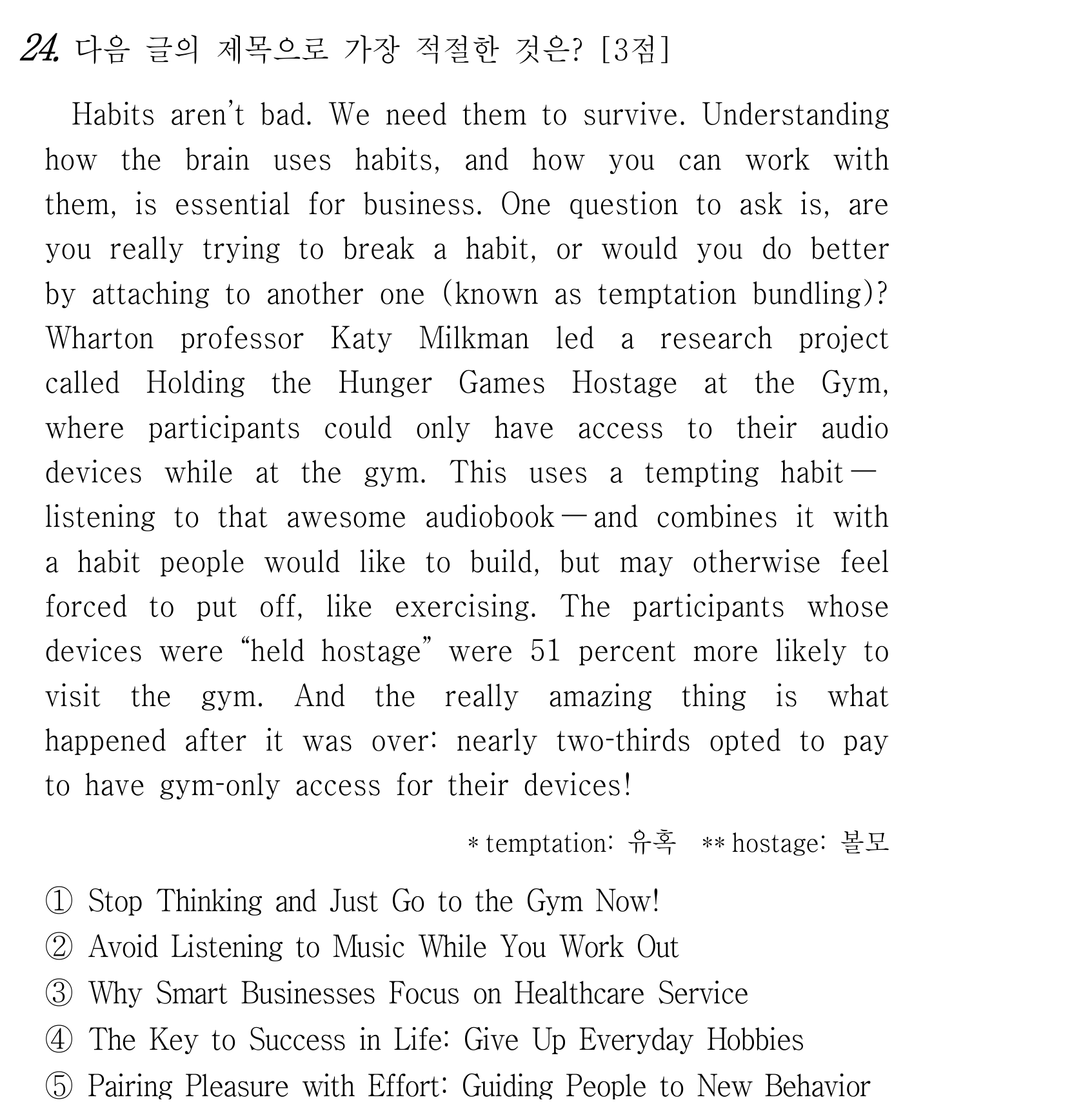 이번 문제는 습관을 단순히 '나쁘다'고 치부하지 않고, 우리 삶의 도구로 사용하는 방식을 다루고 있어요. 정답은 바로 5번, "Temptation Bundling: A Strategy to Build Better Habits"입니다.