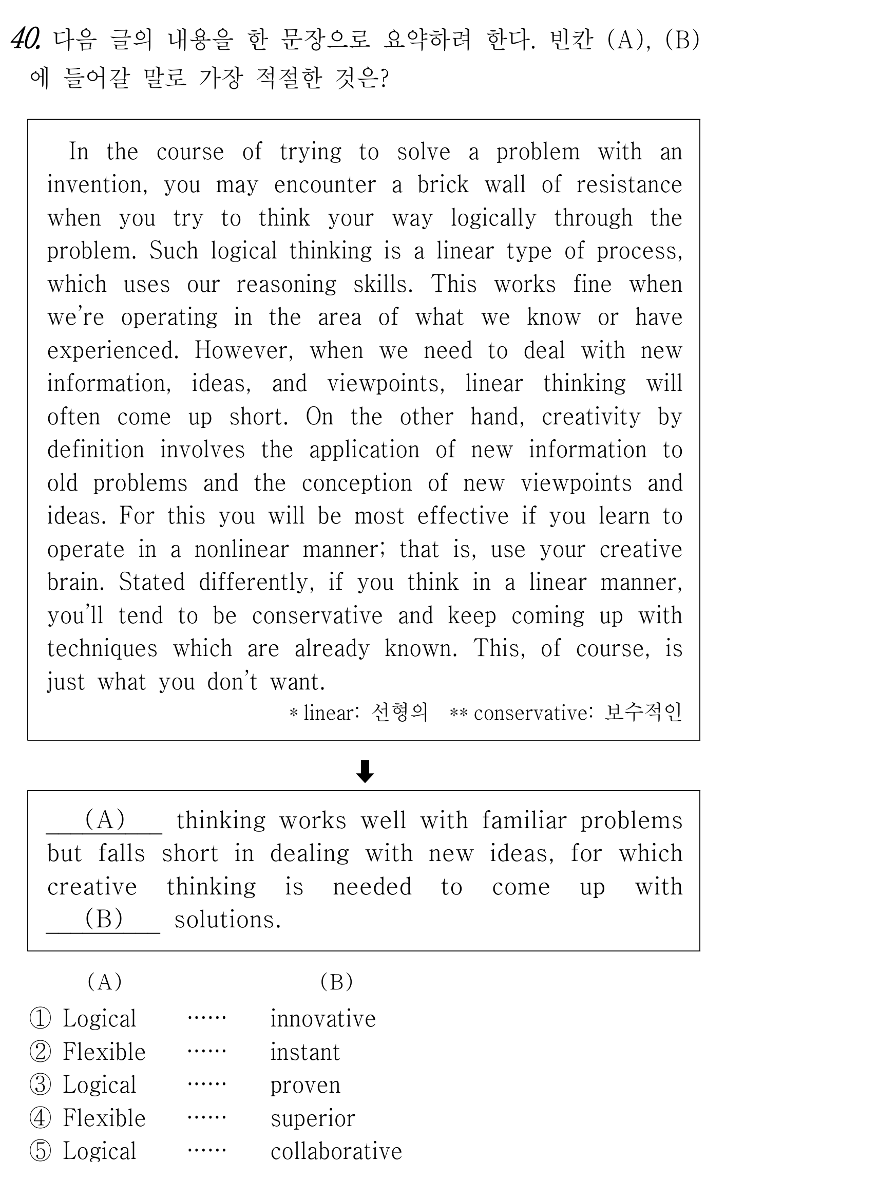 앞부분에서 '선형적 사고(linear thinking)'가 익숙한 문제에는 좋지만 새로운 아이디어에는 부족하다고 했죠? 그러니까 (A)에는 Logical이 들어가야 해요. 그리고 뒷부분은 창의적 사고가 필요하다고 했으니, 당연히 새로운 해결책이 나와야겠죠? 그래서 innovative가 정답입니다.