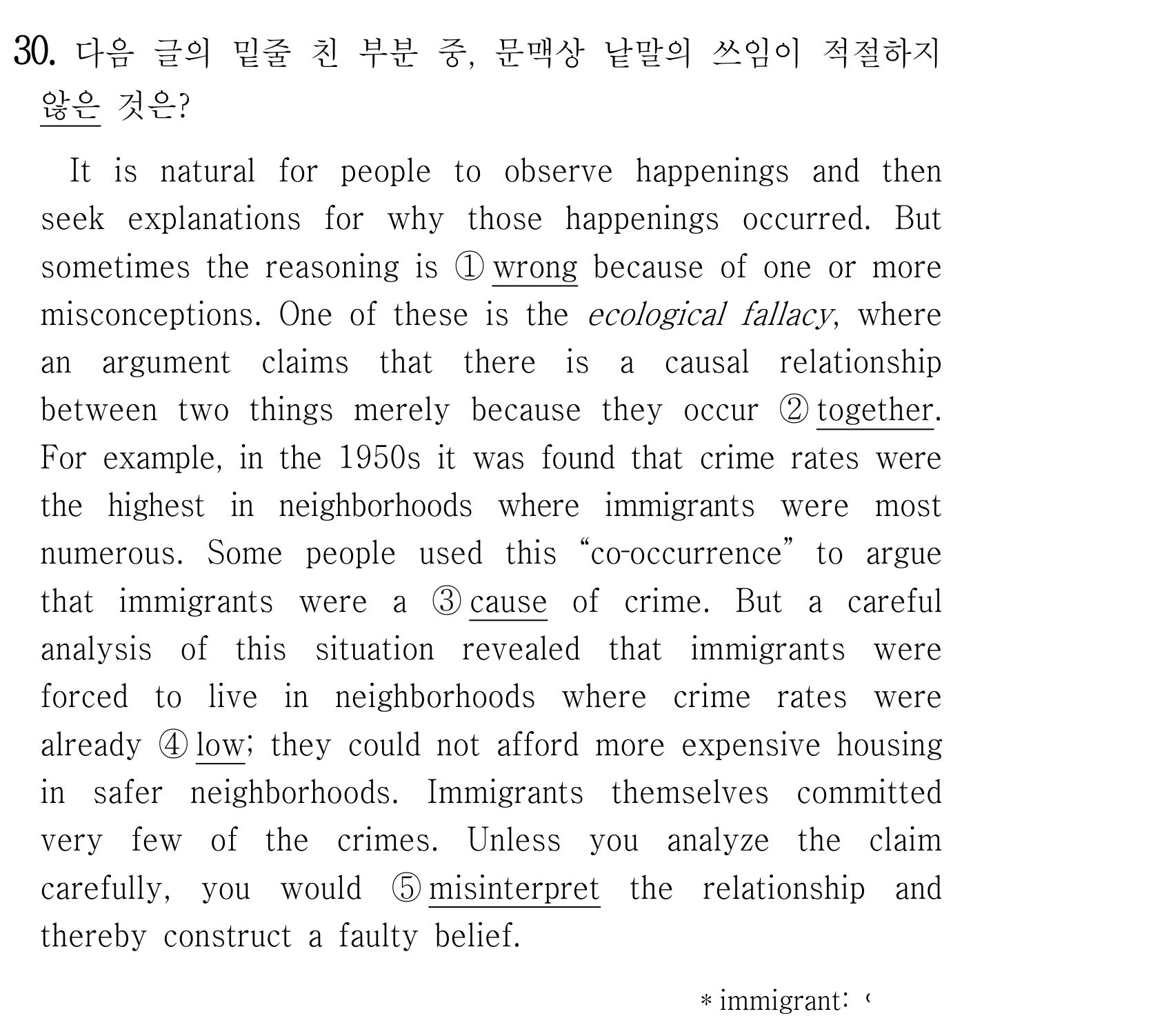 It is natural for people to observe happenings and then seek explanations for why those happenings occurred. But sometimes the reasoning is ① wrong because of one or more misconceptions. One of these is the ecological fallacy, where an argument claims that there is a causal relationship between two things merely because they occur ② together. For example, in the 1950s it was found that crime rates were the highest in neighborhoods where immigrants were most numerous. Some people used this “co-occurrence” to argue that immigrants were a ③ cause of crime. But a careful analysis of this situation revealed that immigrants were forced to live in neighborhoods where crime rates were already ④ low; they could not afford more expensive housing in safer neighborhoods. Immigrants themselves committed very few of the crimes. Unless you analyze the claim carefully, you would ⑤ misinterpret the relationship and thereby construct a faulty belief.