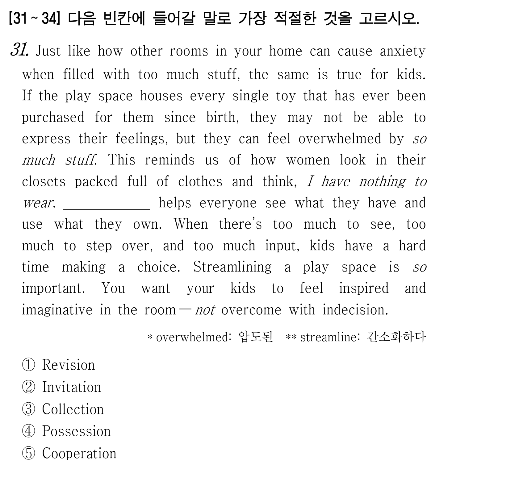 정답은 1번 (Streamlining a play space is so important) 입니다. 다음에 또 만나요!