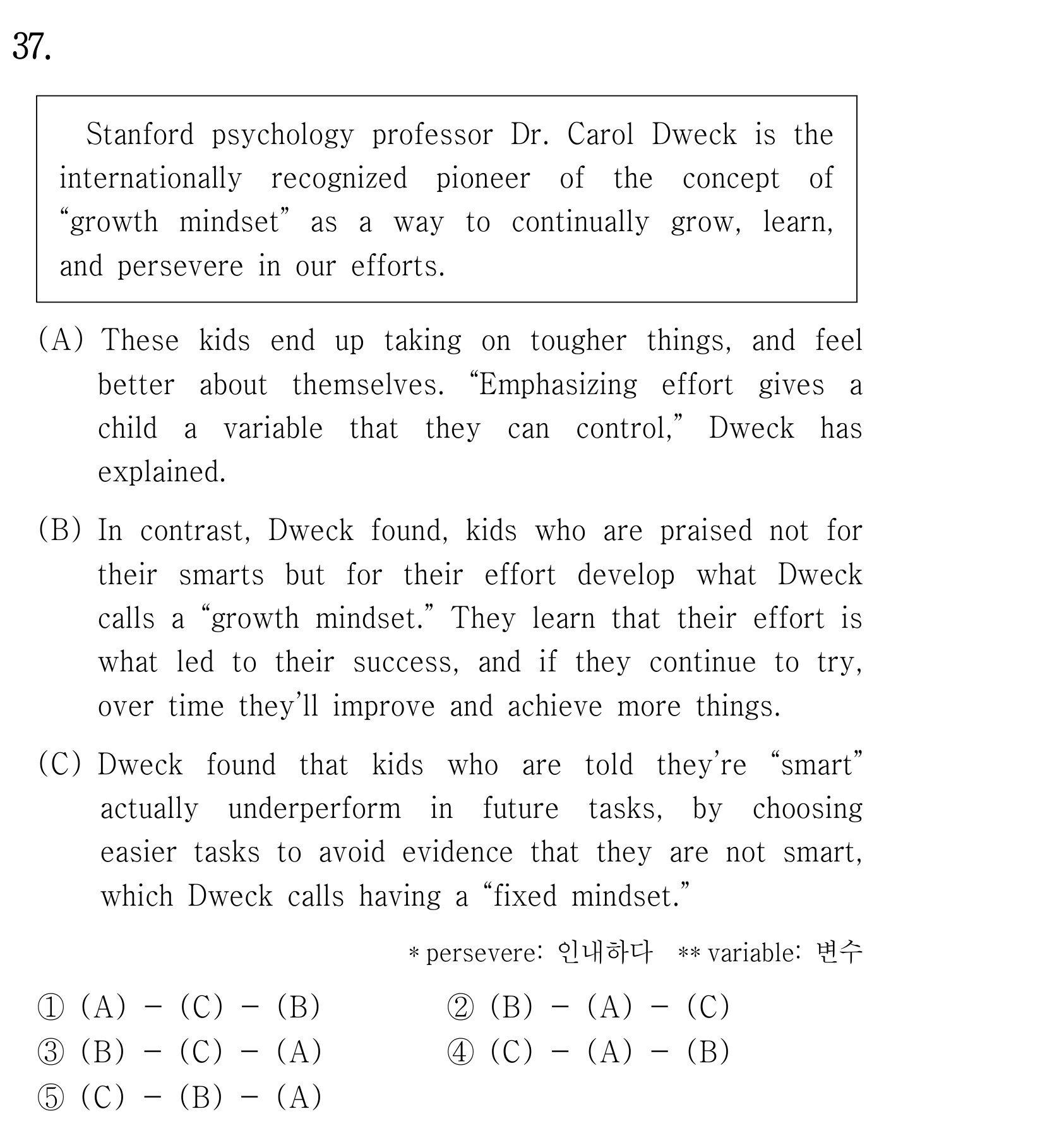 첫째로, 주어진 글에서는 Carol Dweck 교수가 '성장 마인드셋'의 선구자라는 배경을 설명하며 글을 시작합니다. (C)에서는 이와 대비되는 개념인 '고정 마인드셋'을 가진 아이들의 특징을 먼저 언급해요. "영리하다"는 칭찬이 오히려 독이 되어 쉬운 것만 찾게 된다는 부정적인 결과를 보여주죠.
