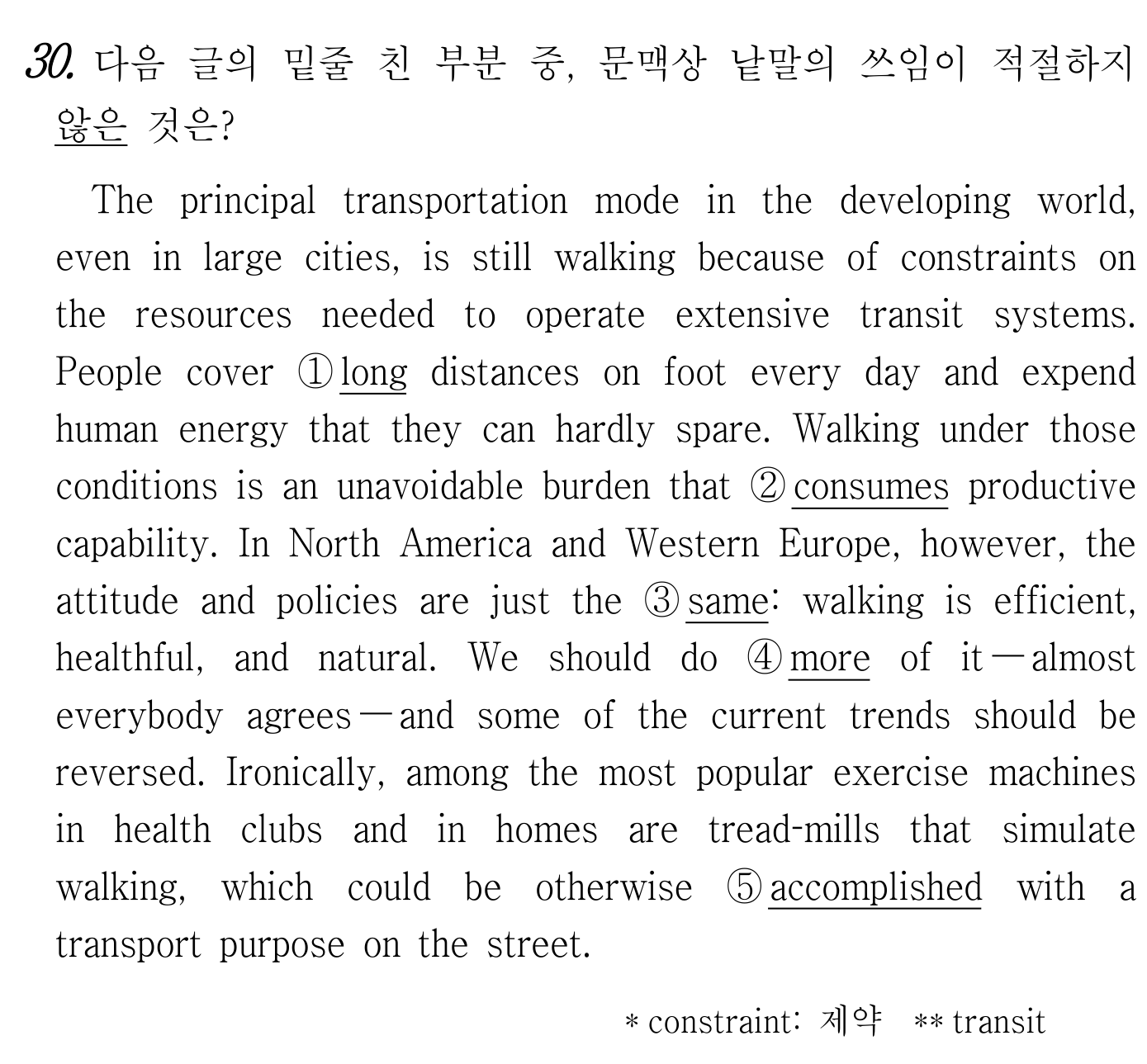 The principal transportation mode 형용사구in the developing worldS, even in large citiesM, isV stillM walkingSC 부사절because of constraints on the resources 형용사절needed to operate extensive transit systemsM.