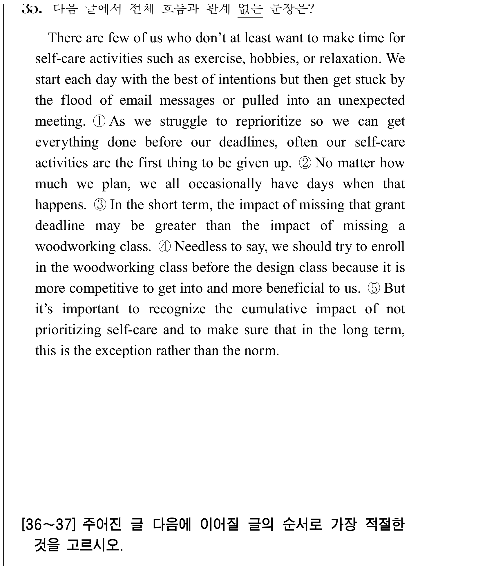 정답은 4번입니다. 4번 문장은 자기 관리의 중요성을 강조하는 전체 흐름에서 벗어나 단기적인 업무 마감의 중요성만을 부각하고 있기 때문에 글의 통일성을 해치고 있지요.