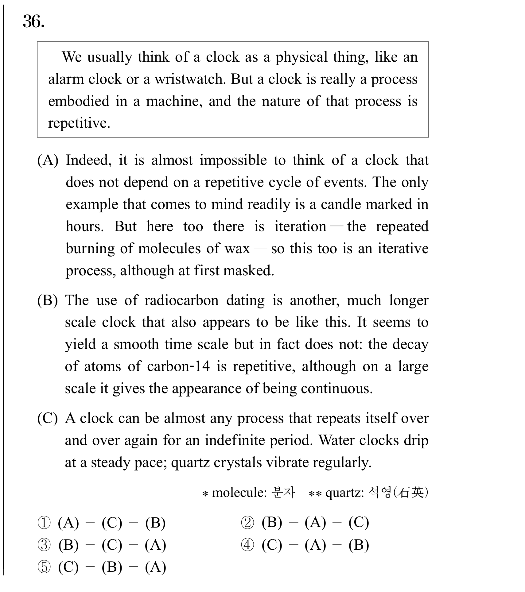 We usually think of a clock as a physical thing — 2025년 11월 고3 36번 순서 문제 풀이 및 해석