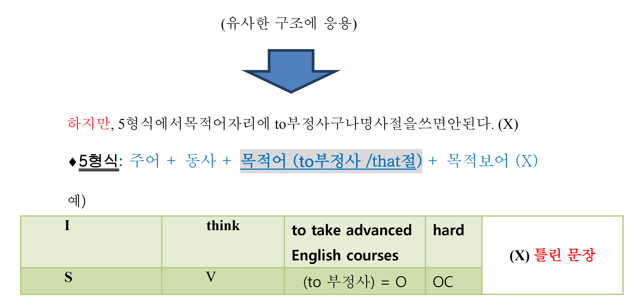 여기서 만약 목적어 자리의 간단한 명사 대신 명사구가 들어온다면, 즉 to부정사나 **that절(명사절)**이 목적어 자리로 들어오게 된다면, 문장은 더 길어지고 복잡해지게 됩니다. 이런 경우, 영어에서는 길고 부담스러운 목적어를 그대로 두지 않고, **가짜 목적어(it)**를 사용하여 문장을 간결하게 만듭니다.