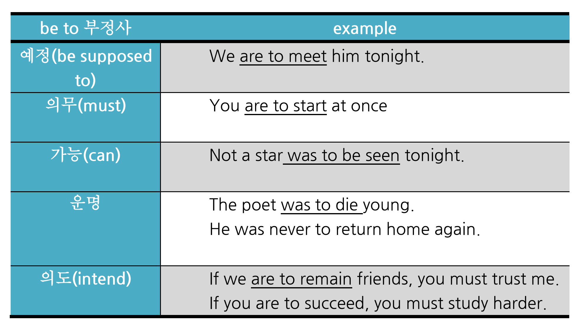자 오늘은 be to 부정사를 알아보았는 데요. 간단히 다시 말하면 "~하는 것이다"라고 해석이 되어 주어와 be 동사가 = 이 되면 명사적 용법(이때 to 부정사는 보어역할을 하고) , 만약 두 번째 설명한 대로 예정, 가능, 의무 등으로 해석되면 두 번째처럼 (이름은 형용사적 용법의 서술적 용법이라고 하는데 몰라도 됩니다. 수고하셨습니다.